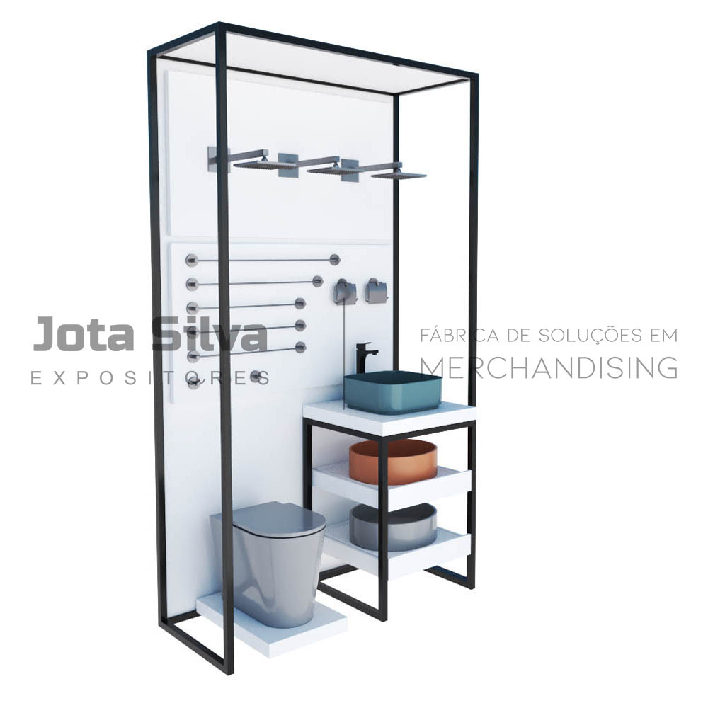 MDF AND METAL DISPLAY STAND WITH 02 DRAWERS FOR SINK, 02 REMOVABLE PANELS FOR SHOWER AND ACCESSORIES AND 01 BASE WITH CASTER FOR BASIN